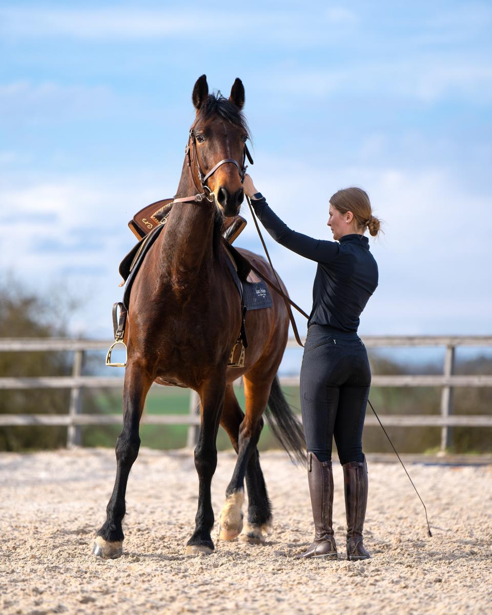 Isiena ist eine 2013 geborene KWPN-Stute, die im August 2022 im Rehazirkel aufgenommen wurde. Sie zeigte deutliche Widersetzlichkeiten beim Reiten und auch im Umgang, die auf ihre Kissing Spine Diagnose zurückgeführt wurde. Rehazirkel-Mitglied Nina Pfister hat sich von Anfang an ihrer angenommen und konnte zum Glück nie derartige Probleme feststellen. Isiena zeigte sich ab dem ersten Tag extrem willig und motiviert. Inzwischen ist die freundliche Stute zur weiteren Rehabilitation in die Rudat Stables zu Carolin Rudat umgezogen.